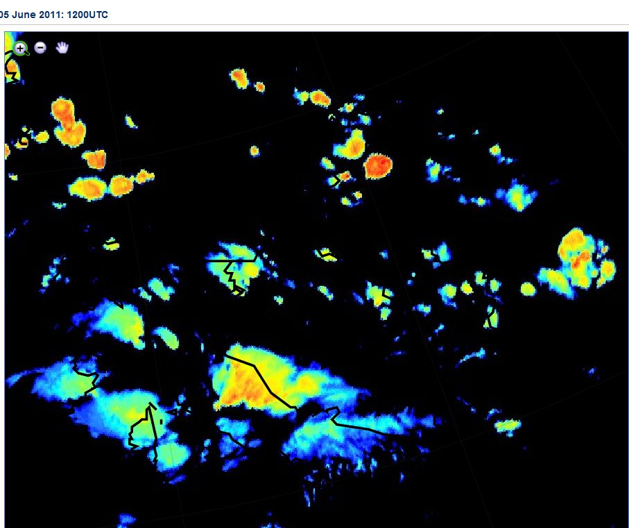 This application typically uses IR images that represent cloud top temperatures. Different colors are assigned to specific temperature ranges.