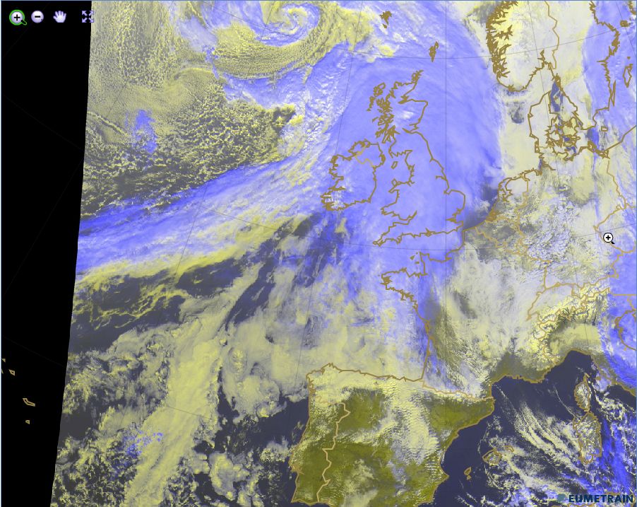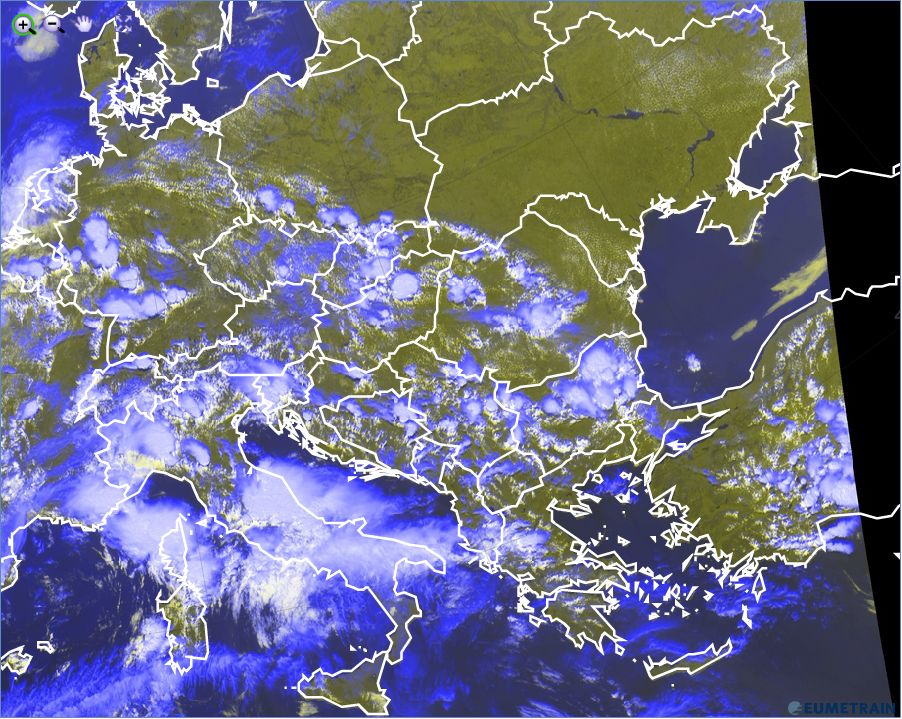 This RGB is very useful for convective systems, as it lets us tell the thick Cb kernel apart from the thin high Cirrus anvil, as well as recognizing the overshooting tops. A convective summer case is presented below: