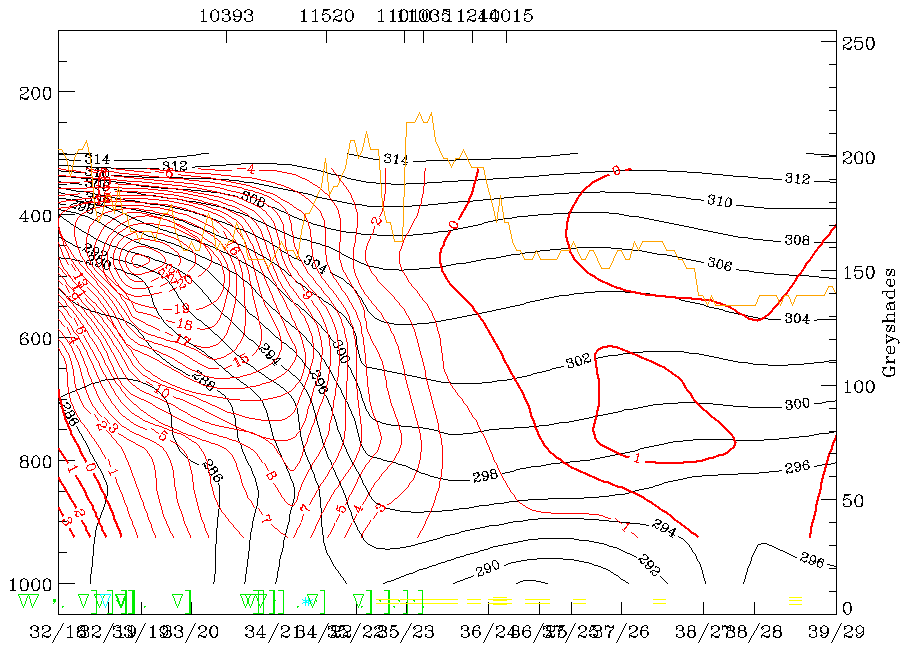 11 February 1997/06.00 UTC - Vertical cross section; black: isentropes (ThetaE), red thin: temperature advection - CA, red thick: temperature advection - WA, orange thin: IR pixel values, orange thick: WV pixel values