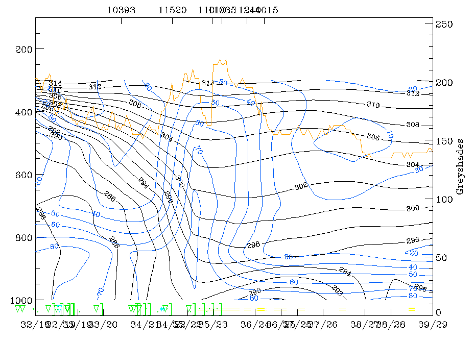 11 February 1997/06.00 UTC - Vertical cross section; black: isentropes (ThetaE), blue: relative humididty, orange thin: IR pixel values, orange thick: WV pixel values