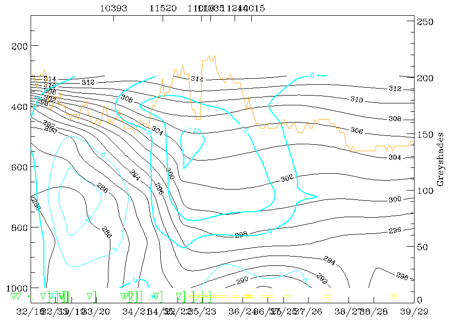 11 February 1997/06.00 UTC - Vertical cross section; black: isentropes (ThetaE), cyan thick: vertical motion (omega) - upward motion, cyan thin: vertical motion (omega) - downward motion, orange thin: IR pixel values, orange thick: WV pixel values