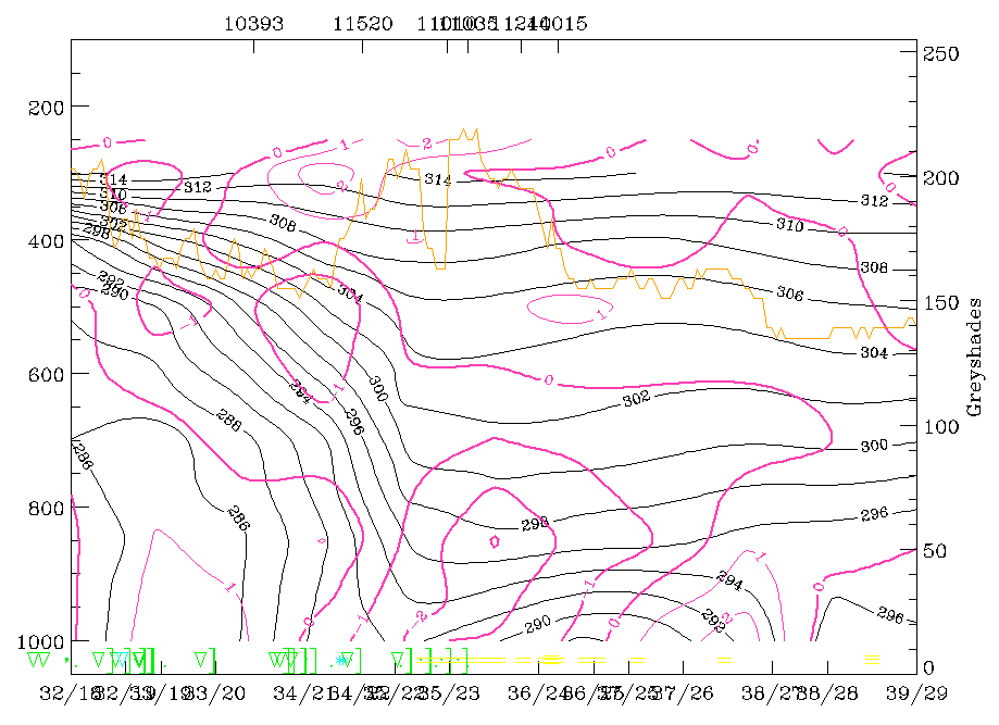 11 February 1997/06.00 UTC - Vertical cross section; black: isentropes (ThetaE), magenta thin: divergence, magenta thick: convergence, orange thin: IR pixel values, orange thick: WV pixel values
