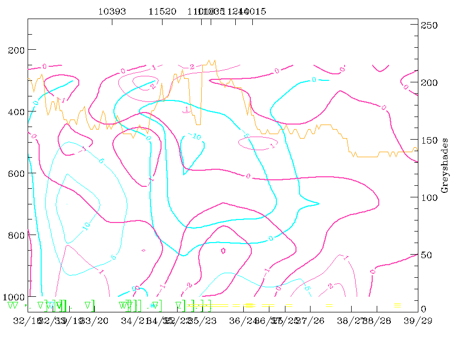11 February 1997/06.00 UTC - Vertical cross section; black: isentropes (ThetaE), magenta thin: divergence, magenta thick: convergence, cyan thick: vertical motion (omega) - upward motion, cyan thin: vertical motion (omega) - downward motion, orange thin: IR pixel values, orange thick: WV pixel values