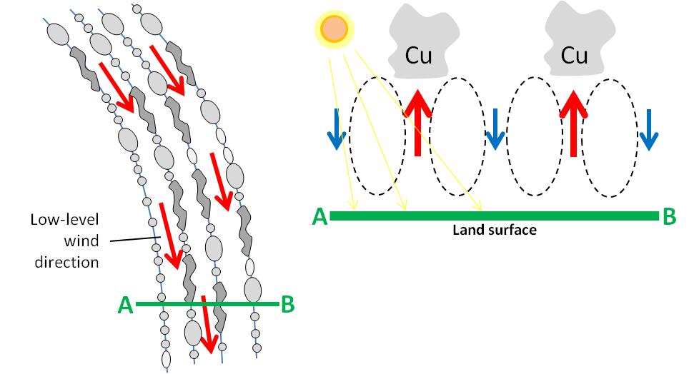 The figure depicts cumulus clouds organized into lines parallel to the low-level wind vector resulting from convective rolls inside the planetary boundary layer (PBL).