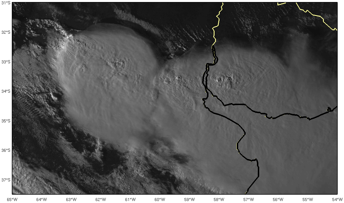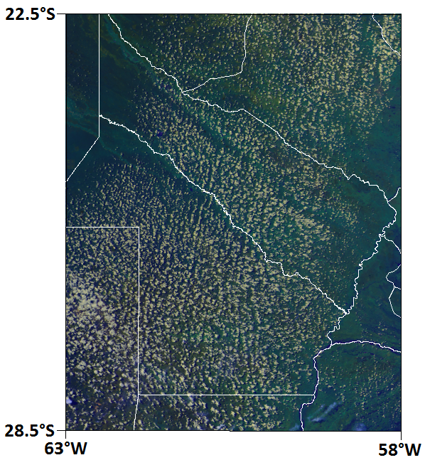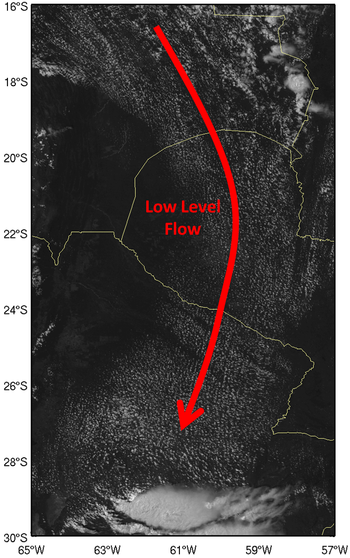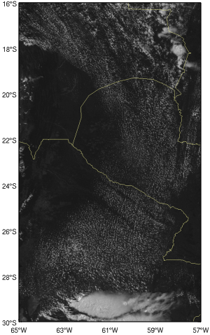 The following VIS and IR GOES images are examples of the appearance of cloud streets within moist low-level advection. The region is close to the Andes, stretching from northern Bolivia to central Argentina, where deep convection can be seen. WV images are available, but not presented because they show WV content only in the middle and upper levels of the troposphere. As a result, the cloud streets cannot be detected in WV images, as they are low-level features.
