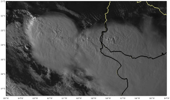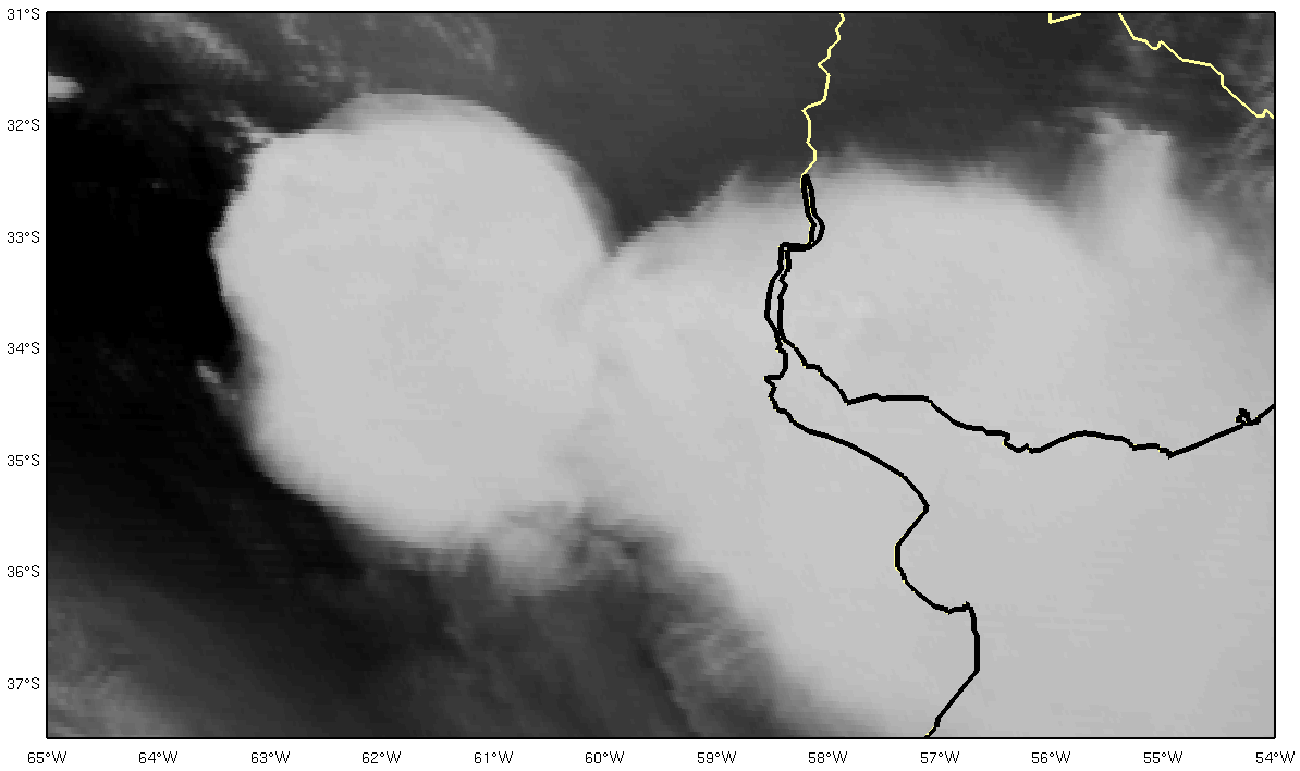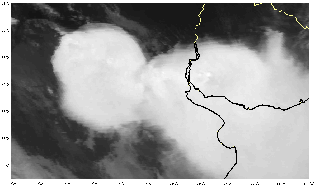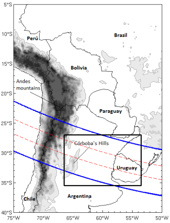 The TRMM (Tropical Rainfall Measuring Mission) satellite with its multiple sensors is perfect for analyzing the structure of mesoscale convective systems in greater detail. Two severe MCSs are shown in this example: one over Córdoba province close to the Sierras de Córdoba and the other over the Entre Ríos province and western Uruguay. The next figure indicates the VIRS (Visible and Infrared Sensor, blue line) and PR (Precipitation Radar, red line) overpasses. The TRMM subset location is marked with a black rectangle.