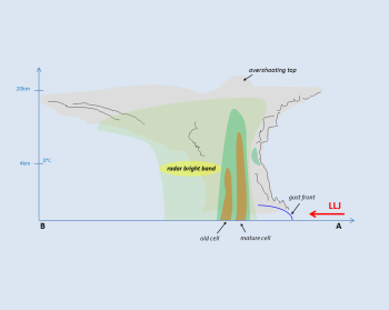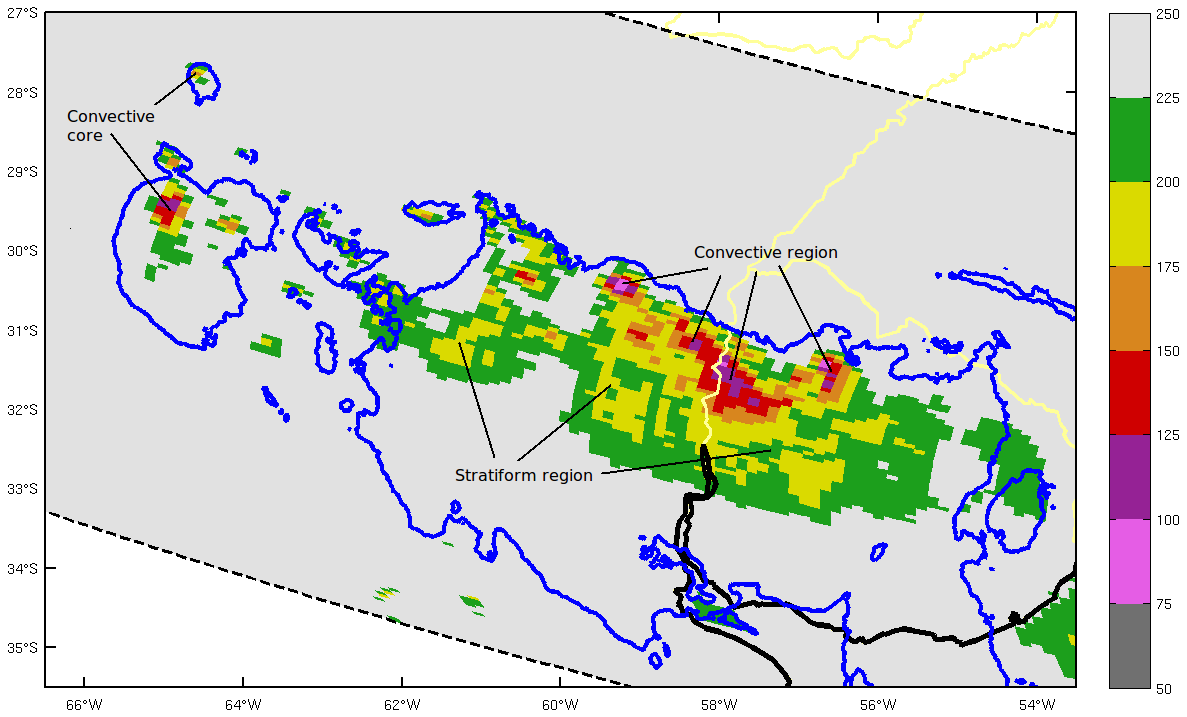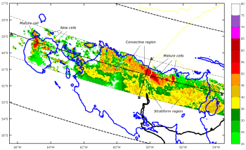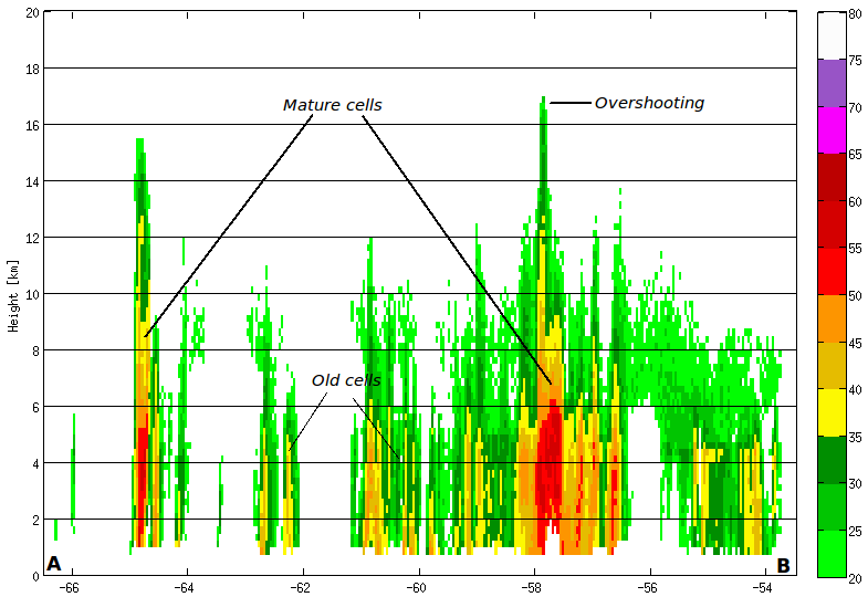 - Maximum column reflectivity and vertical cross section images from eastern Argentina show a typical MCS squall line structure: the leading edge with deepest convective towers, the transition zone and the trailing stratiform precipitation region.