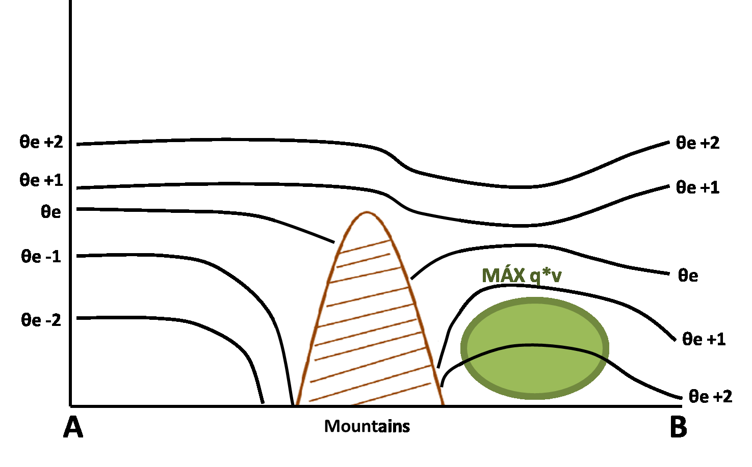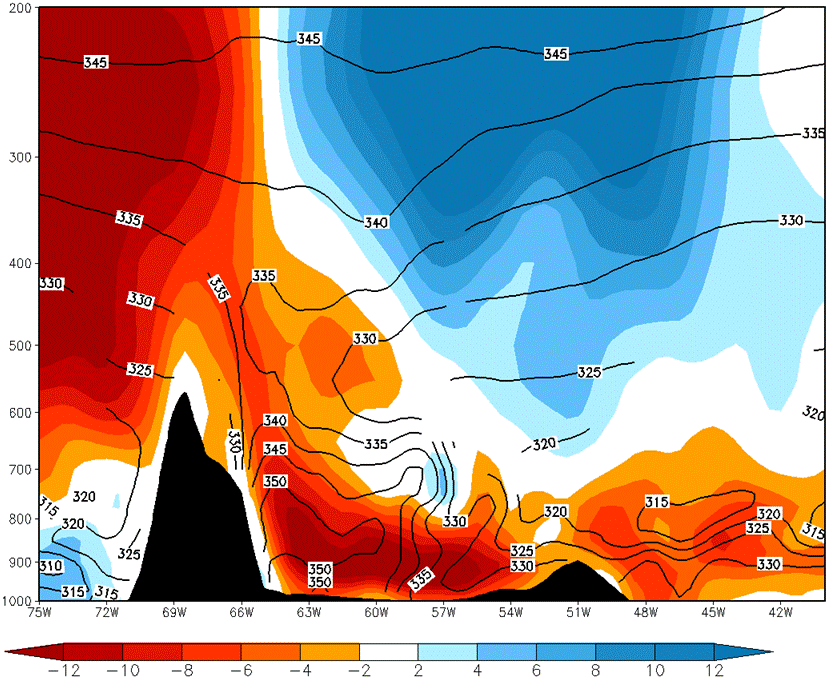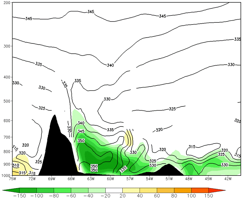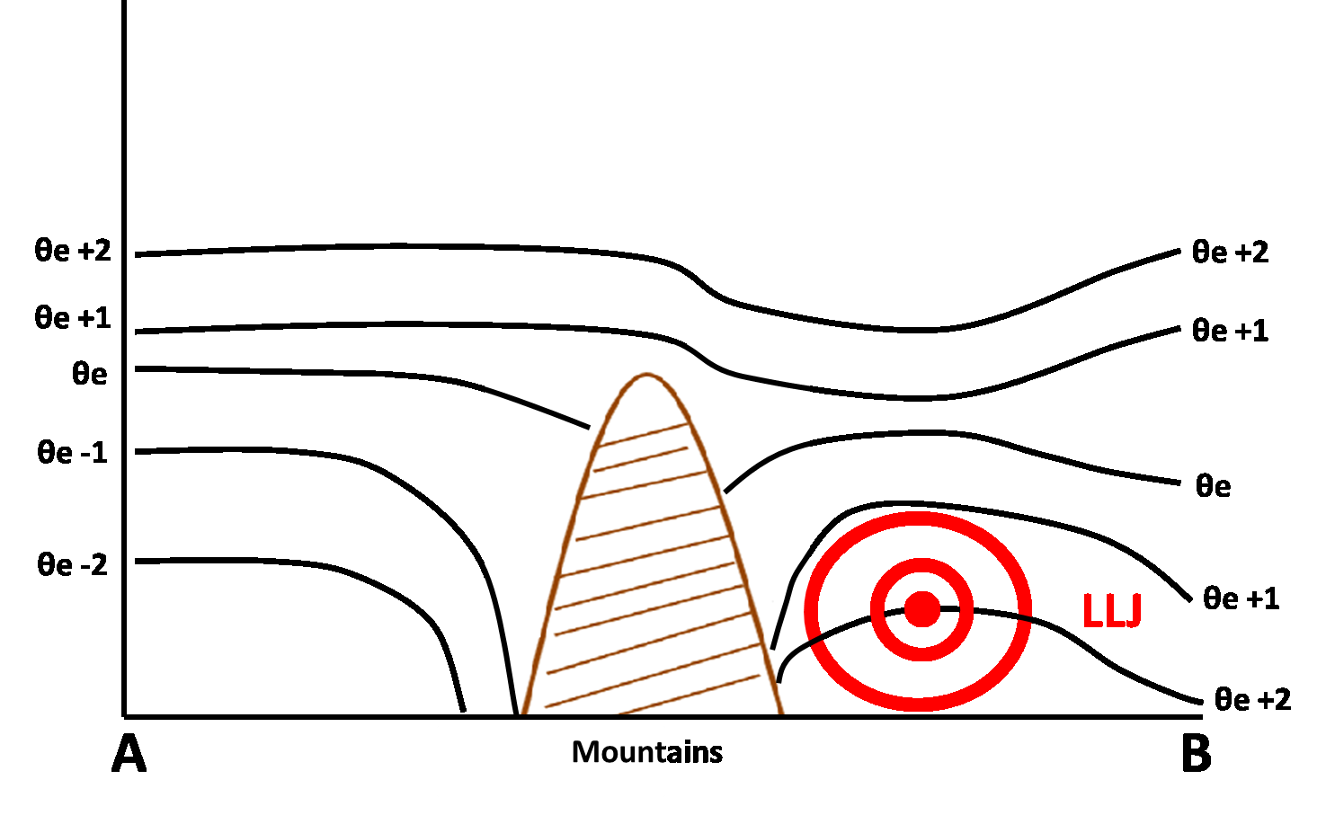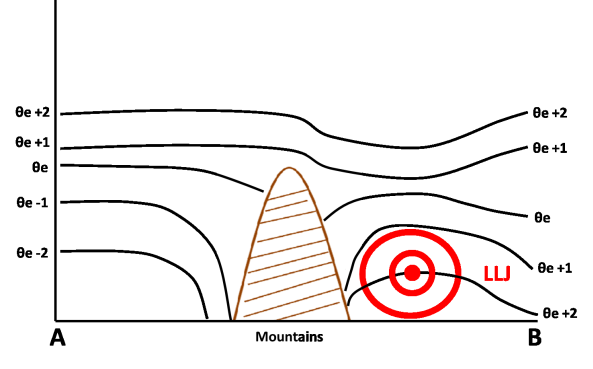 • Equivalent potential temperature: statically unstable area accompanying the wind maximum.