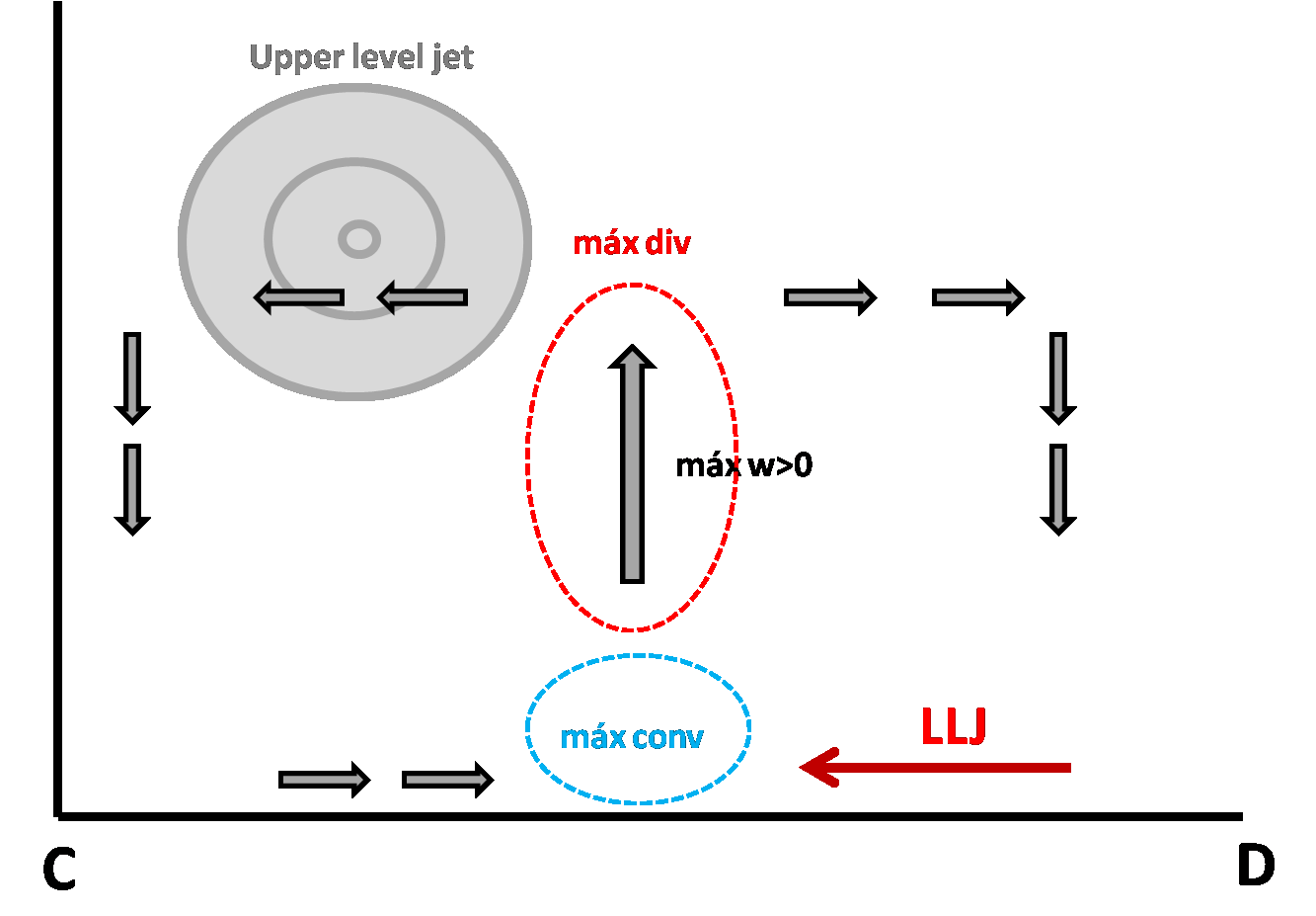 • Convergence and vertical motions: maximum of convergence at low levels and maximum of vertical motion at middle levels in the LLJ exit region.