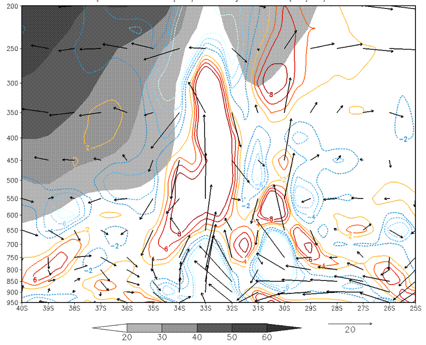 Lon: 60 °W. Zonal wind (shaded, m/s); contours: divergence; arrows: meridional circulation (m/s) 28 Dec 2002 12 UTC