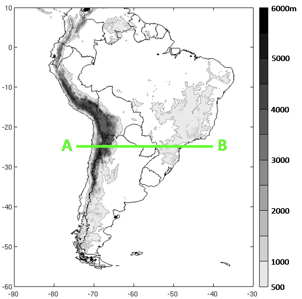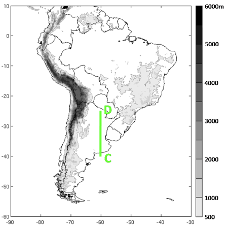 • Meridional wind: maximum of the northerly wind immediately to the east of the Andes at around 850 hPa.