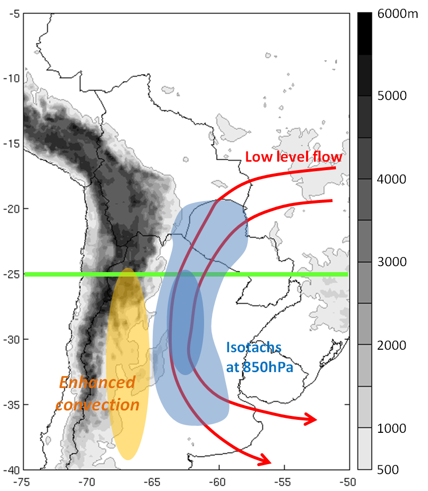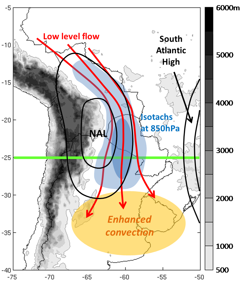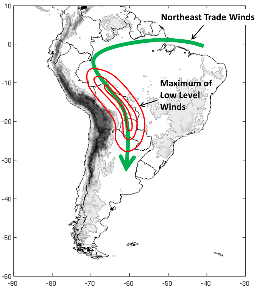 La cordillera de los Andes, una de las mayores del mundo, bloquea y desvía la circulación cercana a superficie, asociada a los vientos alisios, hacia latitudes más altas produciendo una corriente de capas bajas conocida con el nombre de Jet Sudamericano de Capas Bajas (SALLJ -South American Low Level Jet).