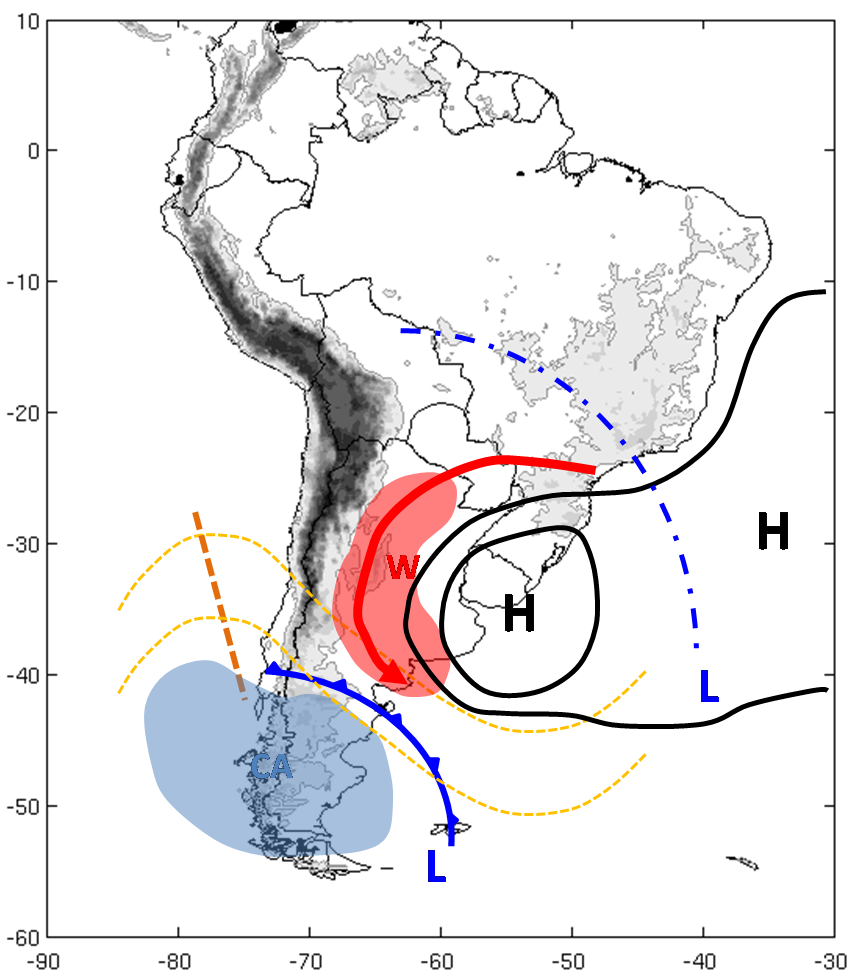 Se desarrolla a lo largo de la periferia oeste de un anticiclón postfrontal. En estos casos, en contraste con los CJEs y NCJEs, la principal fuente de humedad es el Océano Atlántico. La precipitación se desarrolla a lo largo de las pendientes del este de los Andes, en el centro y noroeste de Argentina.
