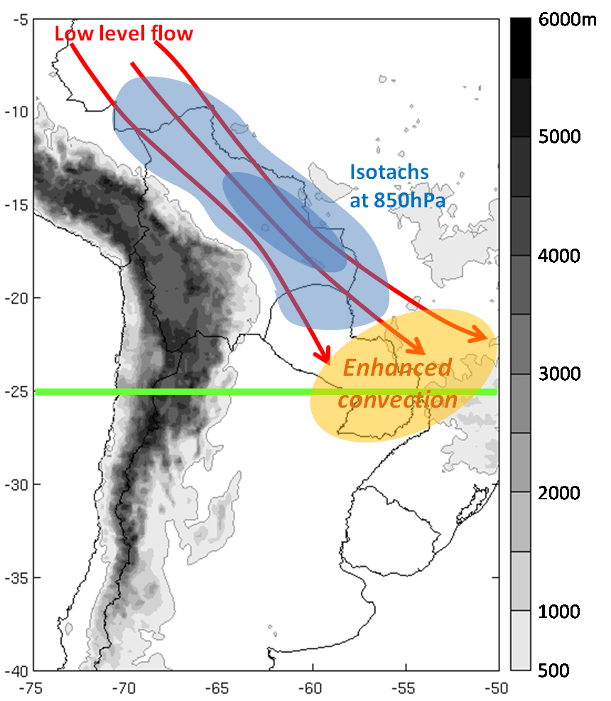 El CJE solamente representa el 17% de los valores medios climatológicos de verano en el sur de Argentina, pero es responsable de una significativa cantidad de la precipitación en SESA (Salio et al., 2007). La mayor parte de la actividad convectiva ocurre sobre el centro y el este de Argentina, sur de Brasil y Uruguay.