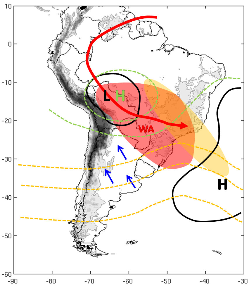 - El ULJ, corriente arriba de los Andes, se desacelera al cruzar las montañas. Esto favorece una circulación meridional ageostrófica indirecta en la región de salida. La rama de capas bajas, flujo de viento del norte, refuerza al SALLJ. Además, a medida que el jet de capas altas cruza los Andes, la subsidencia a sotavento induce calentamiento y anomalías de presión negativas en niveles bajos. Estas anomalías están asociadas a la NAL.