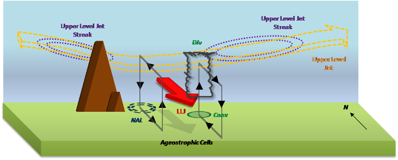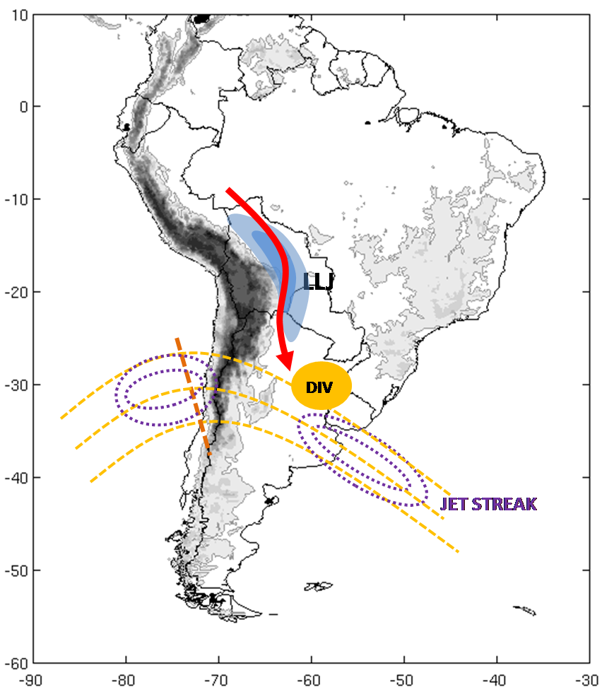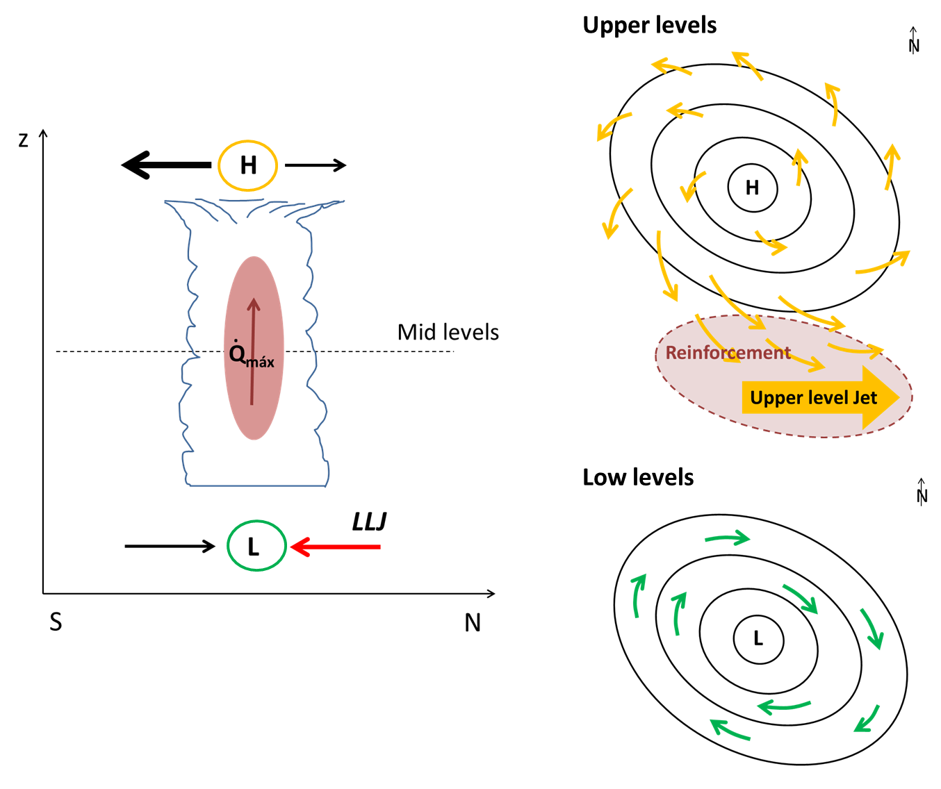 - Cuando la convergencia en capas bajas se acopla con la divergencia superior, a la derecha de la región de entrada del máximo del jet (circulación ageostrófica directa), se ve favorecida y sostenida una intensa convección húmeda. A su vez, el LLJ se acelera debido a la propia convección. Este proceso facilita el desarrollo de convección profunda y organizada en la región tal como los MCSs .