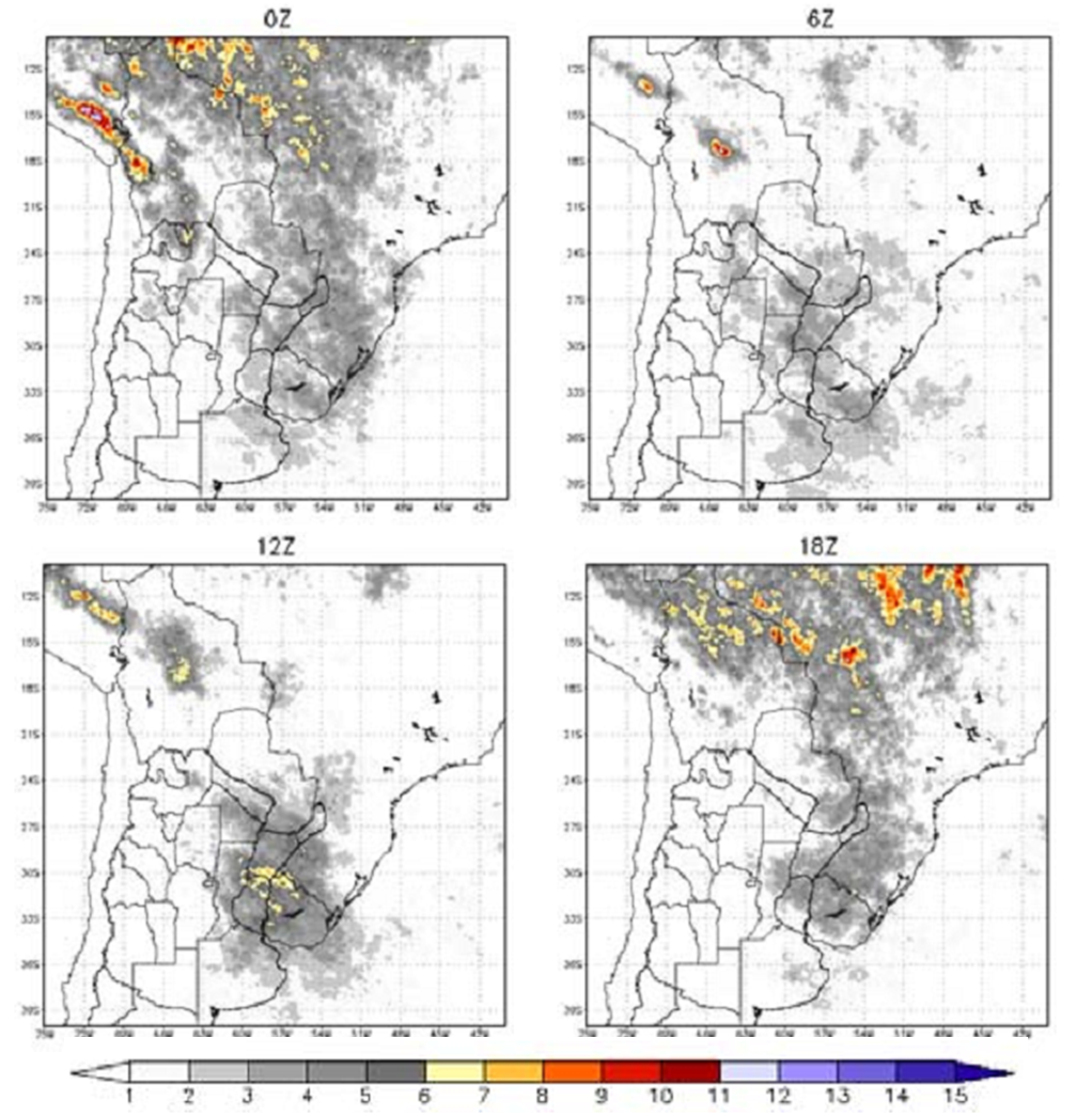 La convección sobre latitudes subtropicales se caracteriza por un máximo cerca de 32°S - 58°O a las 12 UTC. Este máximo se destaca en primavera y es menos importante en verano y otoño; mientras que en invierno no existe. La actividad convectiva en Argentina y el sur de Brasil y Uruguay presenta diferencias. En estos últimos, la convección esta presente durante todo el día, con actividad máxima a la noche, mientras que en Argentina declina a las 18 UTC en todas las estaciones.