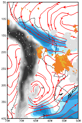 En resumen, la convección al sur de 25°S está claramente asociada al SALLJ. En primavera y otoño exhibe un máximo nocturno sobre la parte oeste y central de SESA. En verano hay dos fases de máxima convección; una es nocturna y la otra ocurre durante la tarde, especialmente al este de SESA. La convección nocturna es iniciada por el máximo del jet de capas bajas. Al anochecer la convección se desencadena por el calentamiento solar de la superficie.