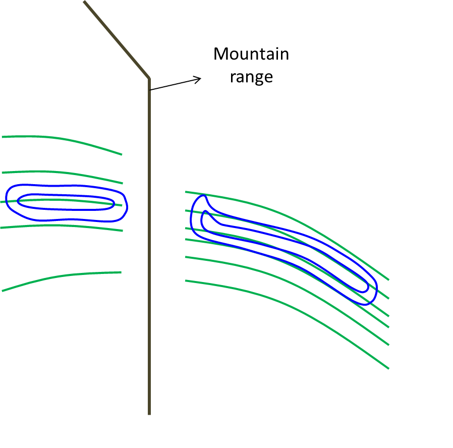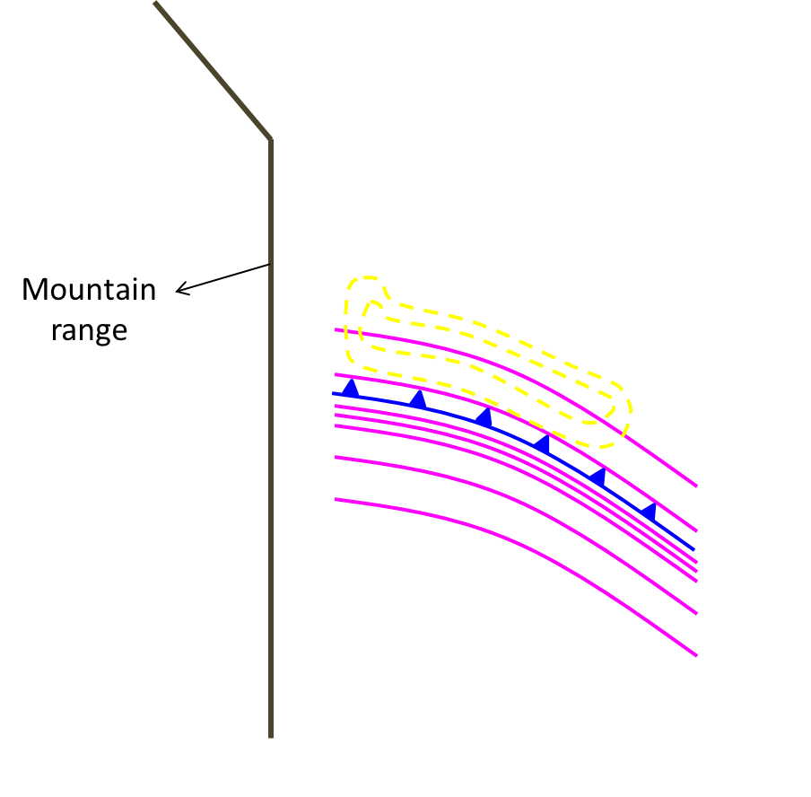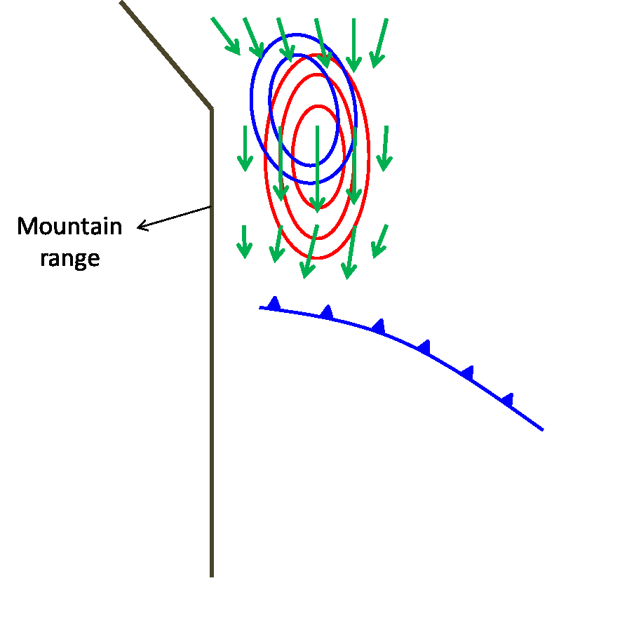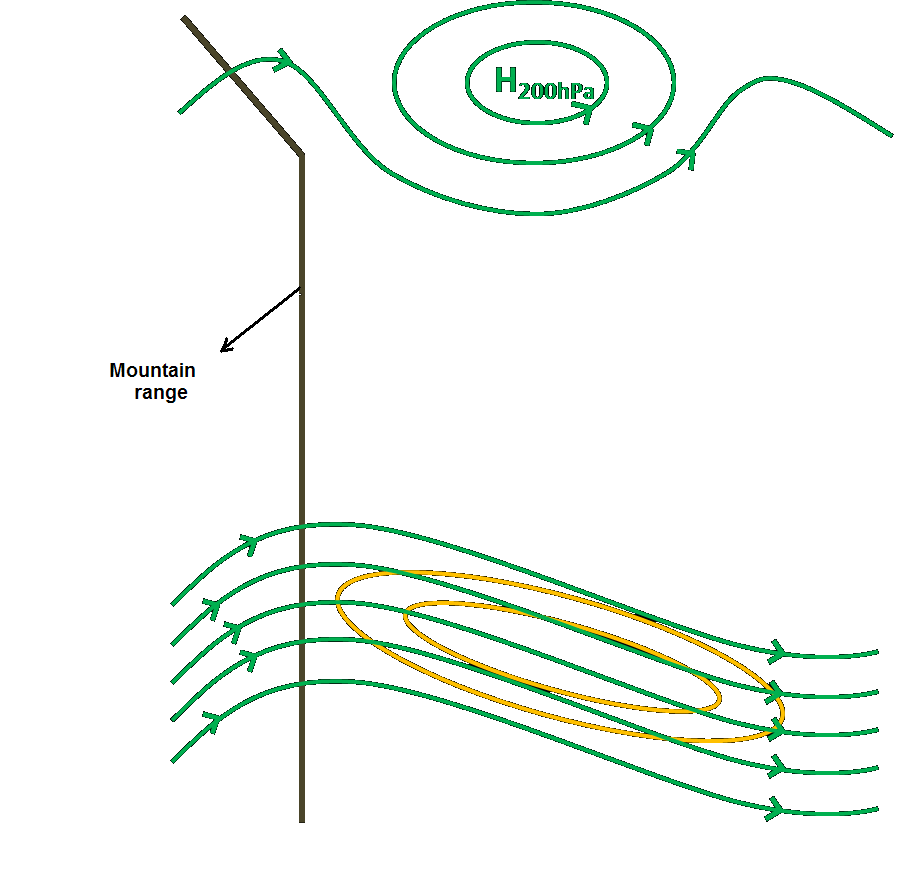 - Cortante de viento 850-700 hPa: la diferencia entre la velocidad del viento en 850 y 700 hPa debe ser igual o mayor que 6 m/s en alguna región encerrada por la isotaca de 12 m/s.