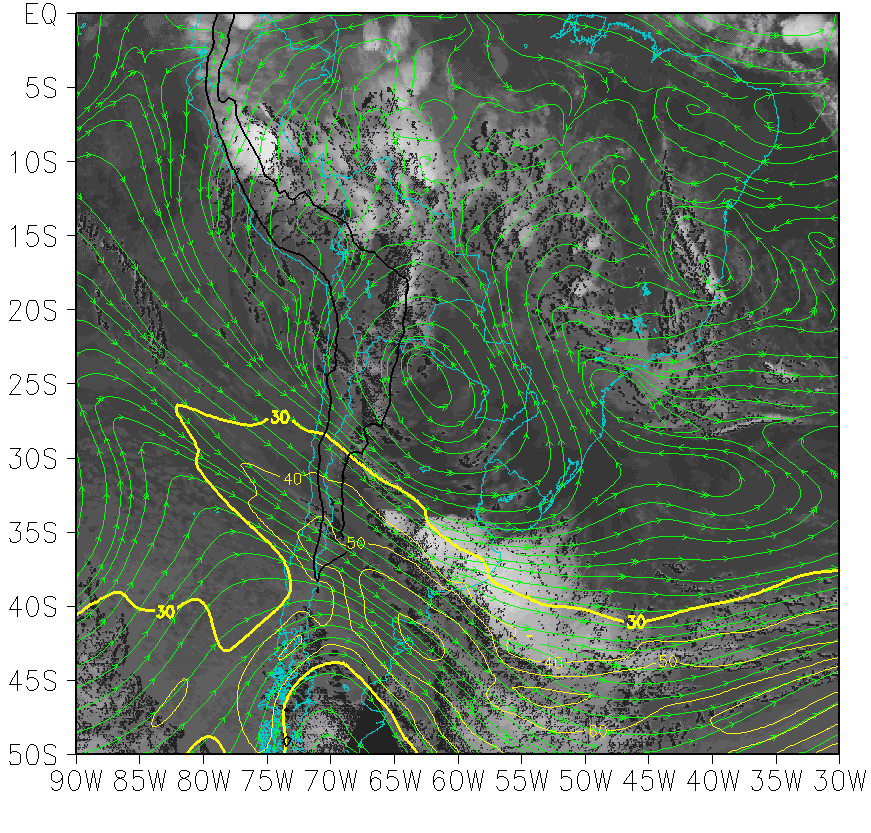 Febrero 28 2002/06.00 UTC - imagen GOES 13 IR 10.8 ; amarillo: isotacas en 250 hPa, verde: líneas de corriente en 200 hPa. |