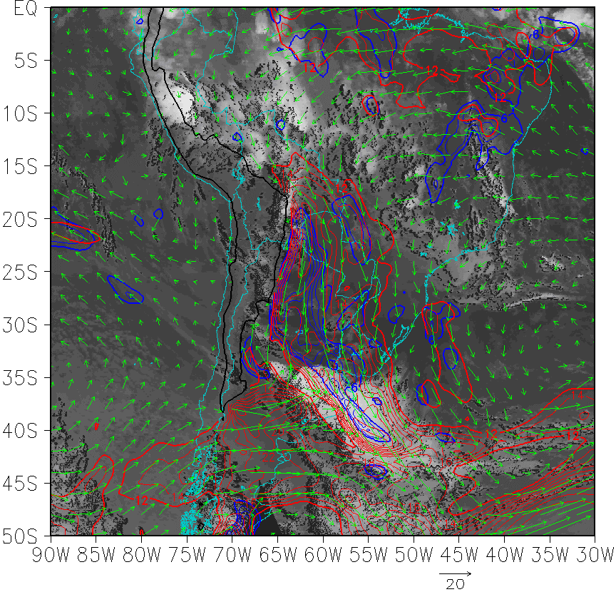 28 de Febrero 2002/06.00 UTC - imagen GOES 13 IR 10.8; azul: cortante de viento en 850-700 hPa, rojo: isotacas en 850 hPa, vector verde: viento en 850 hPa. |