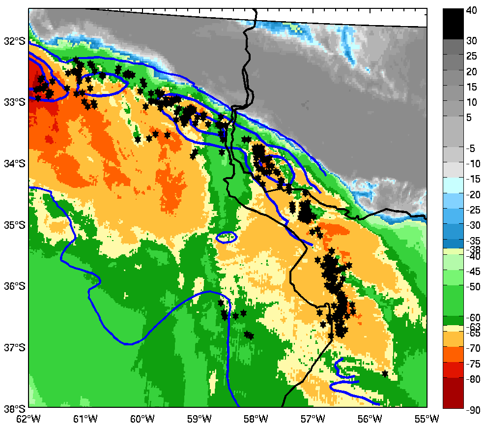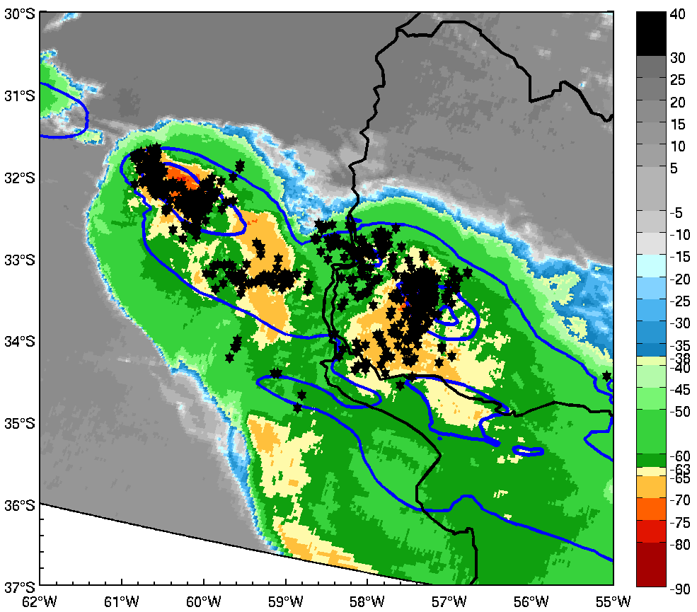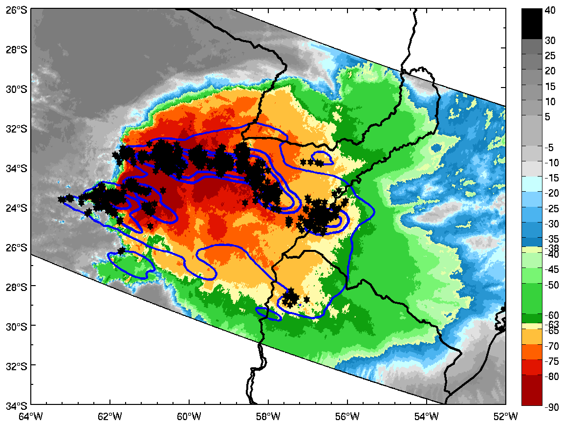 | MCS con superceldas en su interior | 15 de Noviembre 2006/23.36 UTC - Temperatura de topes (sensor TRMM/VIRS IR 10.8, sombreado), localización de descargas eléctricas (sensor TRMM/LIS, puntos negros) y tasa de precipitación (sensor TRMM/TMI, contornos azules). |