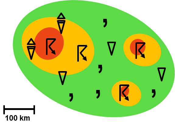| Sistema simétrico | 21 de Diciembre 2003/08.22 UTC - Temperatura de topes (sensor TRMM/VIRS IR 10.8, sombreado), localización de descargas eléctricas (sensor TRMM/LIS, puntos negros) y tasa de precipitación (sensor TRMM/TMI, contornos azules). |