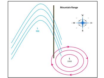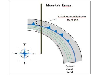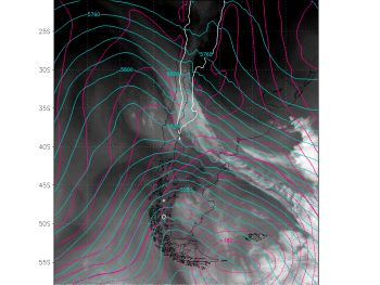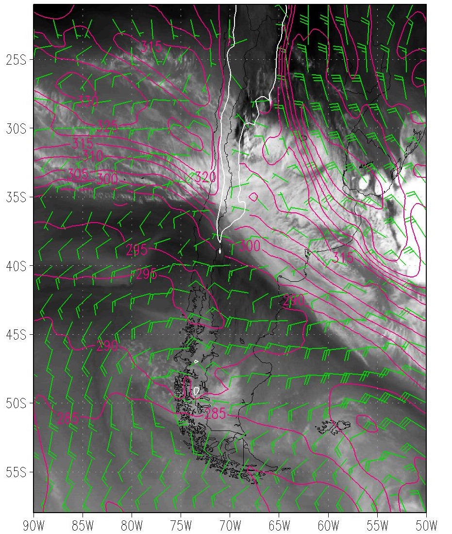 Frontal cloud band related to a strong gradient of equivalent potential temperature south of the Zonda occurrence region. The warm edge of the gradient is near the barrier in the area affected by Zonda wind. -