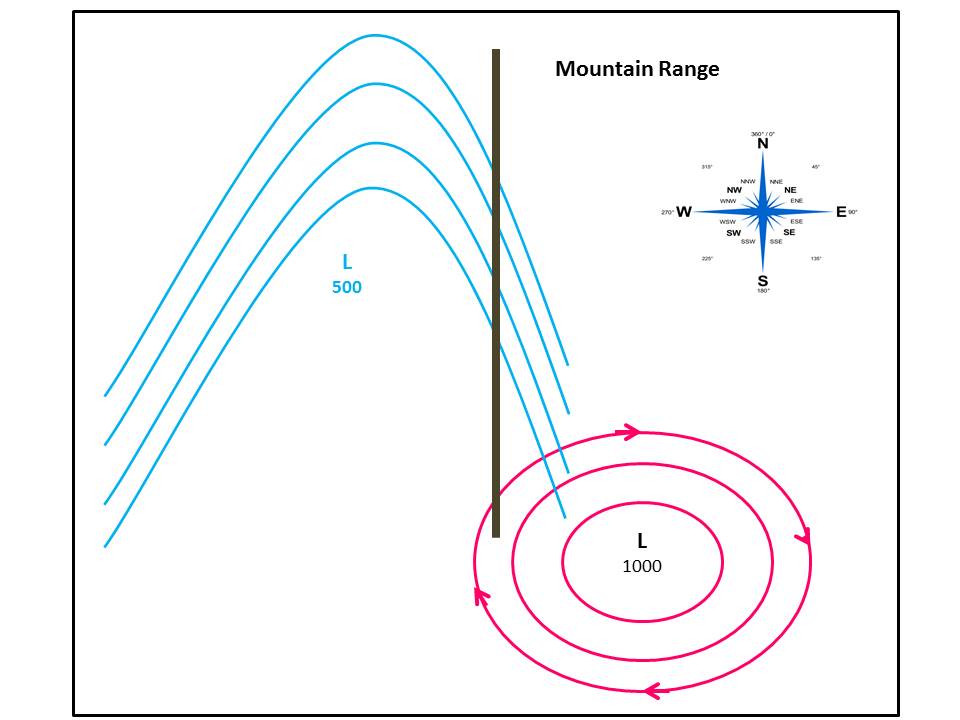 Zonda events: well-developed mid-level trough west of the mountain range. Surface low southeast of the barrier, near the extreme south of the continent. -
