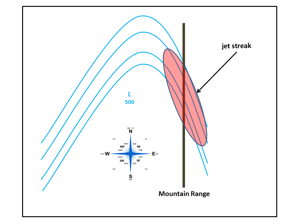 A well-developed mid-level trough and a strong upper-level jet west of the mountain range. Zonal wind velocity at 500 hPa (near the mountaintops of the Andes) generally greater than 15 m/s. -