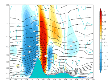 Vertical cross section along 32.5°S. Zonal wind velocity (shaded); black: isentropes (theta-e) on 12 Jul 2006 at 06 UTC.