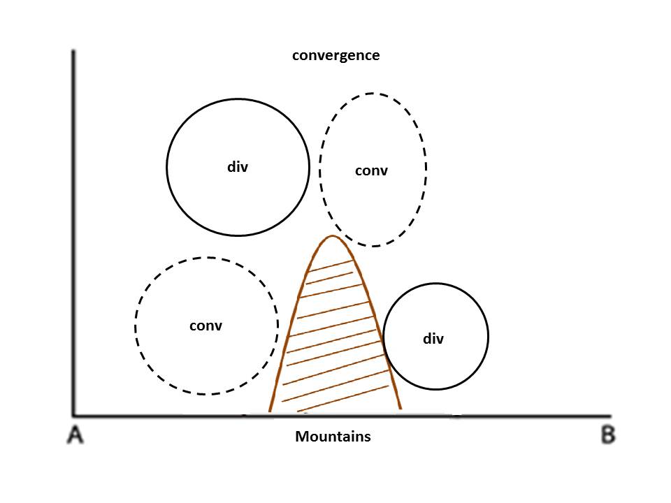 On the windward side, strong convergence from the ground to the mountain top level and divergence above it. On the lee side, convergence at high levels and divergence below it (not quite reaching the ground level). -