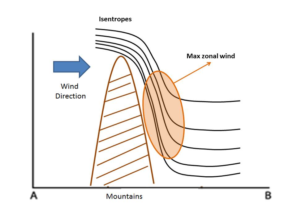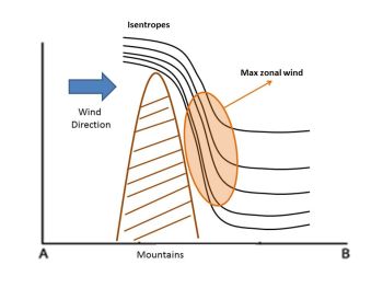 Areas of maximum velocity of winds at high levels descend on the lee side. -