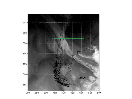Cross sections are taken along 32.5°S (green line) on 12. July 2006 at 06 UTC: