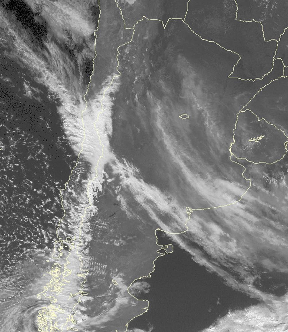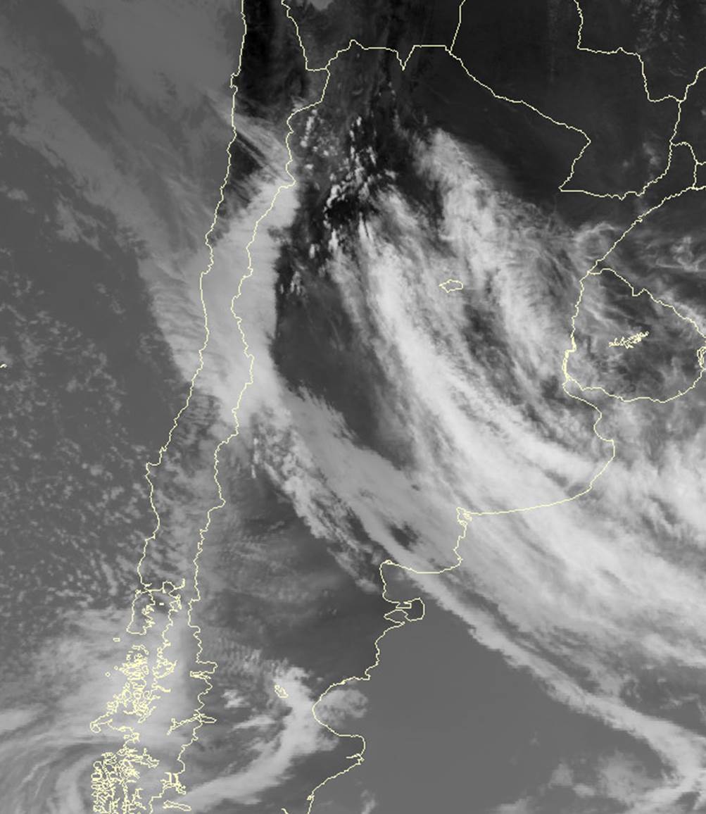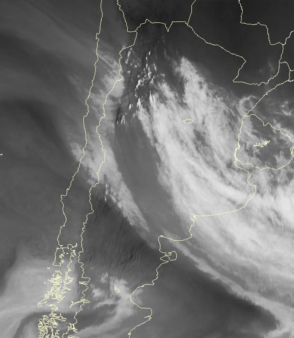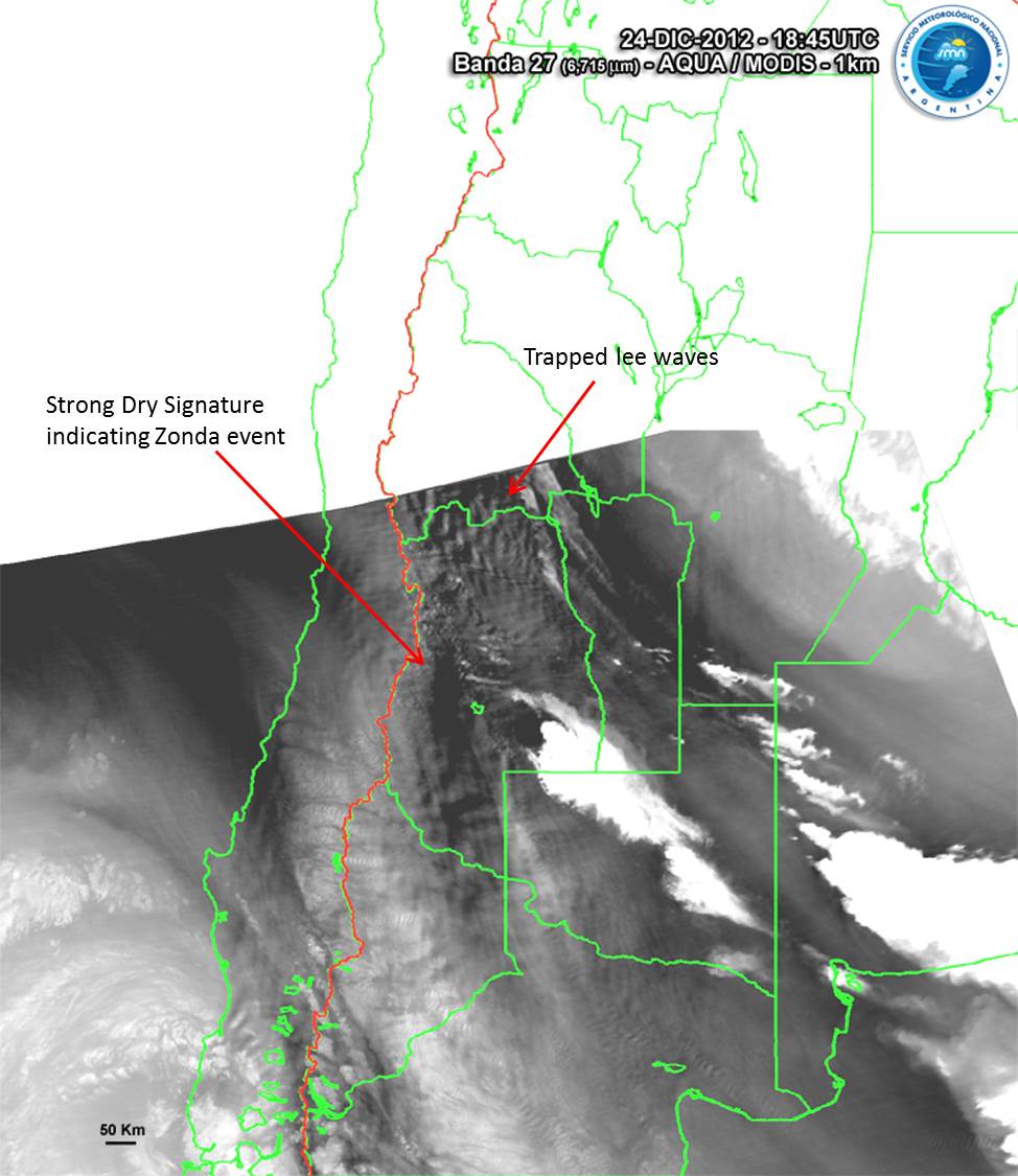 Esquema para imágenes satelitales WV durante un evento de Zonda. 24 de Diciembre 2012/18:45 UTC - AQUA/MODIS Banda 27 (WV-6.715) imagen.