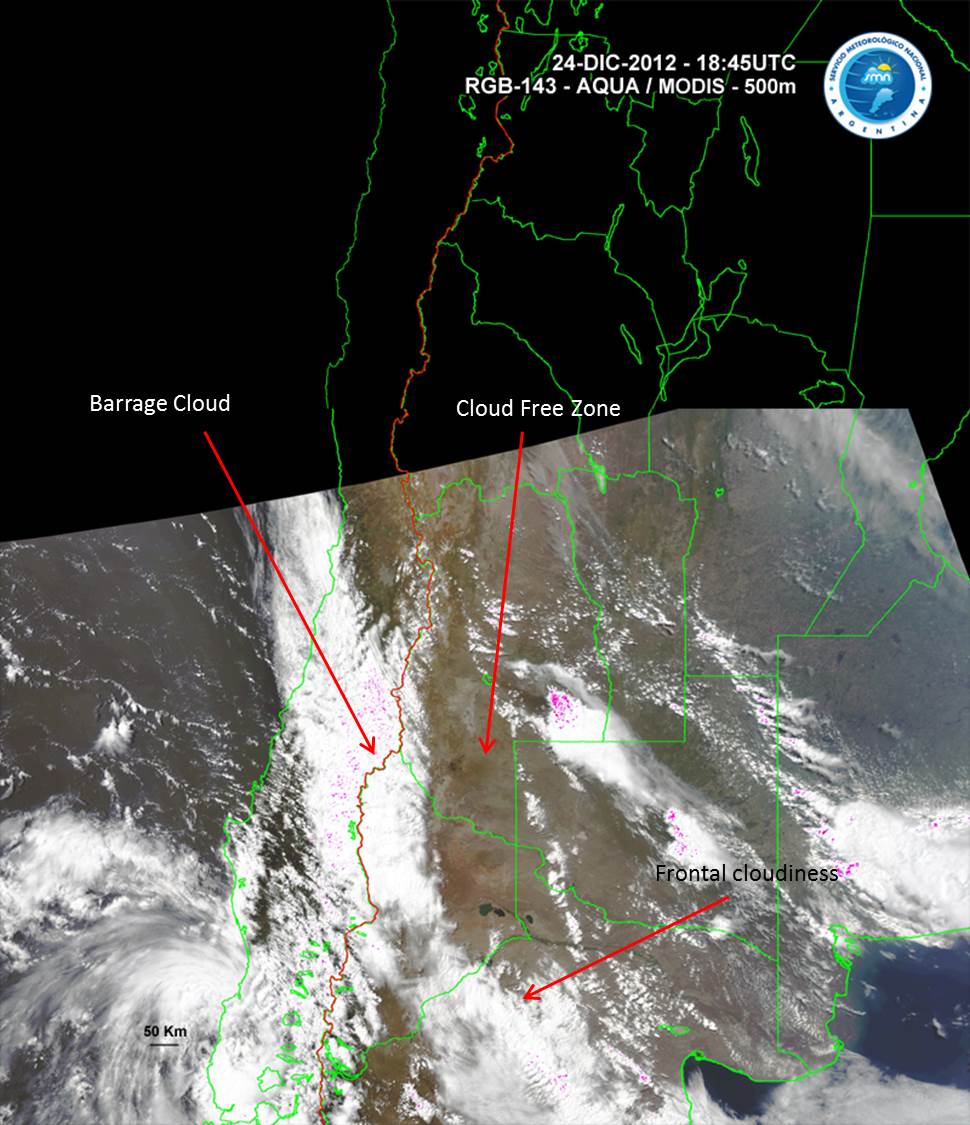 Esquema para imágenes VIS o de color verdadero durante un evento de Zonda. 24 de Diciembre 2012/18:45 UTC - AQUA/MODIS RGB 143 (color verdadero) imagen.