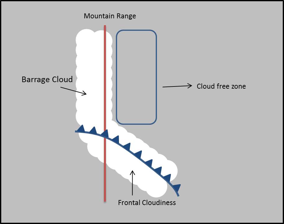El ascenso forzado a barlovento genera un área de nubes sobre la montaña llamada "nube pared".