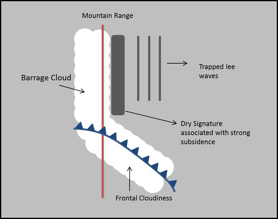 Ocasionalmente se desarrolla una serie de ondas atrapadas a sotavento que se extienden hacia el este de la cadena montañosa. Esta característica se puede ver en las imágenes IR y VIS solamente si hay suficiente humedad para la formación de nubes. Estas nubes suelen típicamente formar bandas largas y paralelas. La zona de descenso de las ondas a sotavento se puede apreciar en imágenes WV, aunque no haya formación de nubes. A veces se observa el polvo levantado por el viento en imágenes visible y compuestas RGB, indicando vientos intensos cerca de superficie.