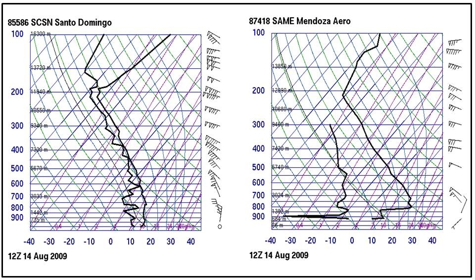 Típico perfil vertical de Temperatura y Temperatura de rocío durante un evento Zonda. 14 de Agosto 2009/12 UTC - Radiosondeos en Santo Domingo, Chile (lado oeste de los Andes) y Mendoza, Argentina (lado este).