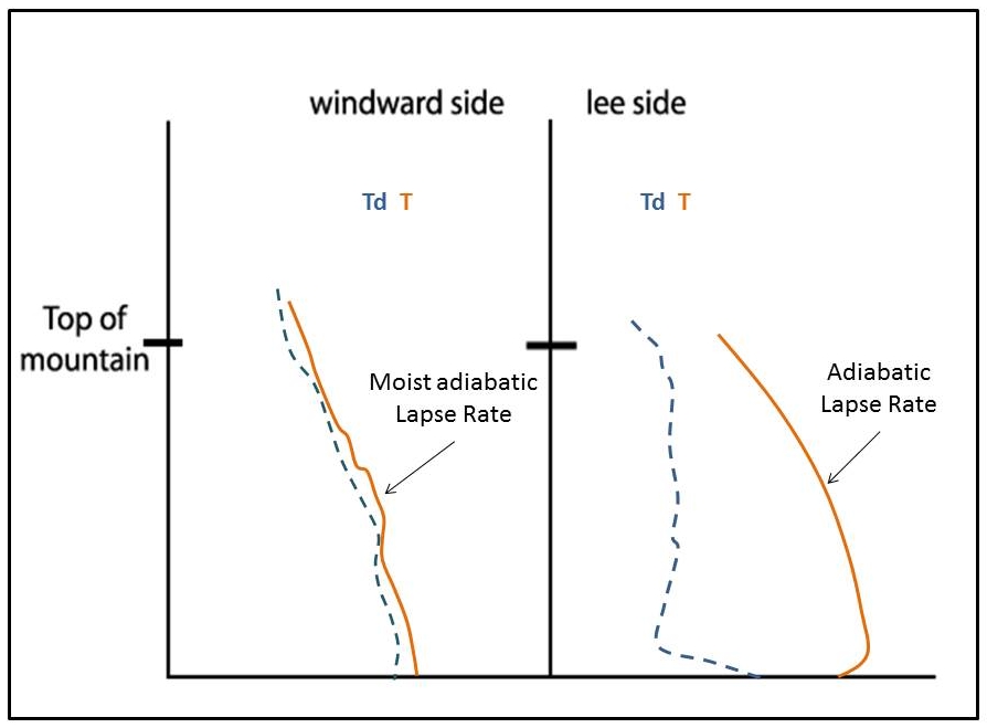 - Estabilidad: La estabilidad vertical y, particularmente, la presencia de capas estables corriente arriba de la altura de las cumbres, favorecen los eventos Zonda. Corriente abajo, una capa inestable de nivel bajo lleva al Zonda más cerca de la superficie. Una vez que el Zonda se ha desarrollado, se establece un gradiente adiabático seco y la troposfera se hace inestable.