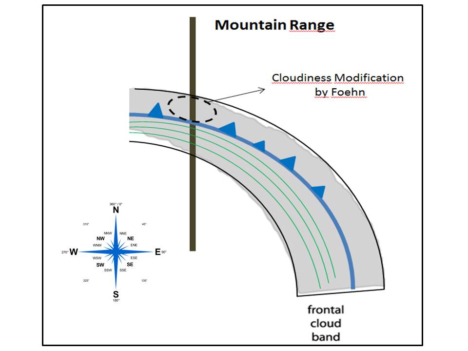 - Temperatura potencial equivalente en 850 hPa: banda de nubes frontal relacionada a fuerte gradiente de temperatura potencial equivalente al sur de la región de ocurrencia de viento Zonda. El borde caliente del gradiente está cerca de la barrera en el área afectada por viento Zonda.