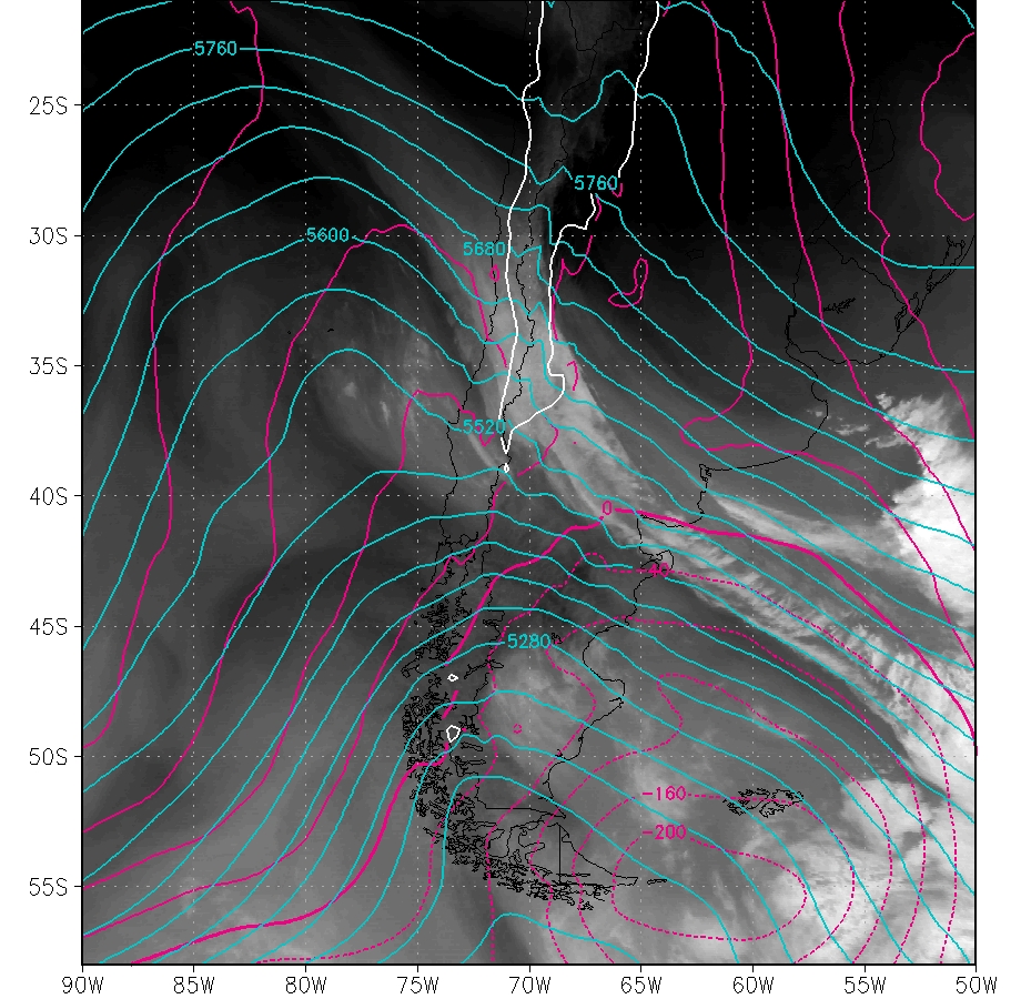 - Altura geopotencial de los niveles de 1000 y 500 hPa: vaguada bien desarrollada al oeste de la cadena montañosa. Baja de superficie al sudeste de la barrera, cerca del extremo sur del continente.