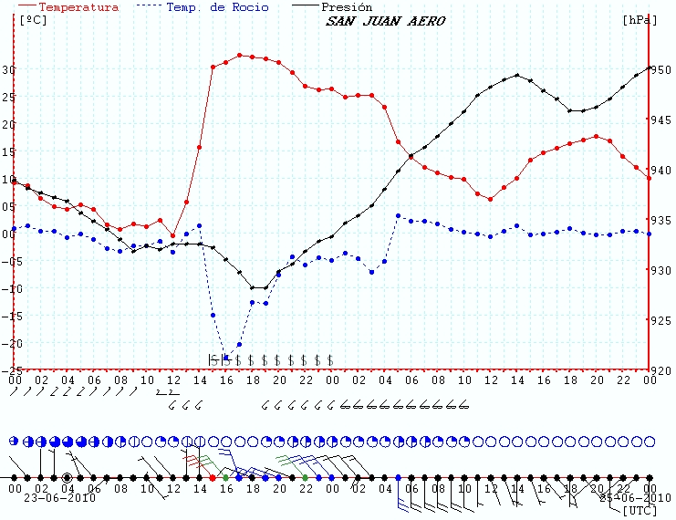 Series temporales de las observaciones de superficie en el aeropuerto de San Juan durante el 23-24 junio 2010 durante un evento Zonda. Temperatura (rojo), punto de rocío (azul) y presión de superficie (negro).