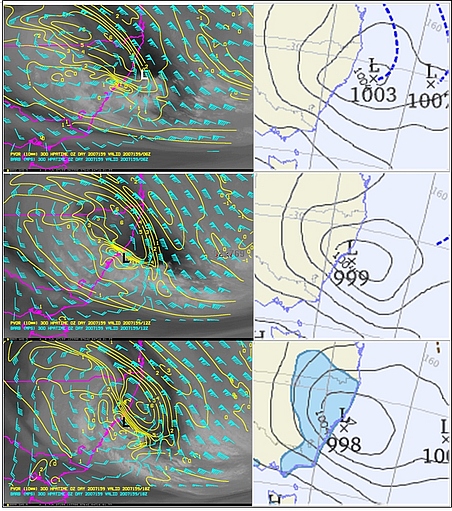 Right panels: MSLP pattern of the corresponding times. The bottom panel also shows the area of the preceding 24 hour rainfall.