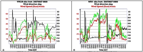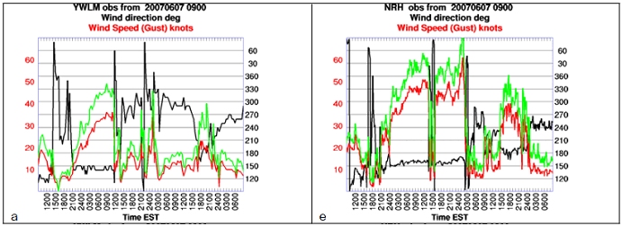 Figure 21: Seventy two hour meteograms starting at 0900 EST 7 June 2007 from Williamtown (left) and Norah Head (right). These locations are shown in the previous figure. Wind direction in black, wind mean (10 minute) in red, gusts in green.Diagram from Mills et al. 2010