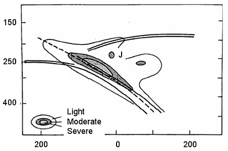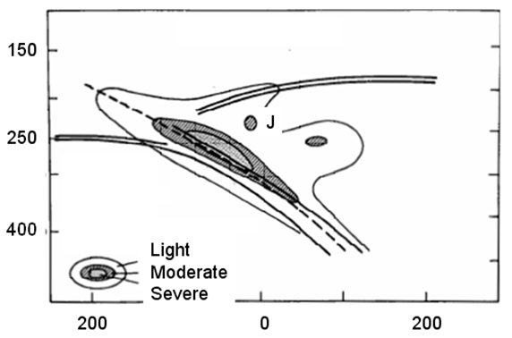 Figure 20: Turbulence associated with a sharp trough. J = jet core. Dashed line is the trough line. Double line is the tropopause.
