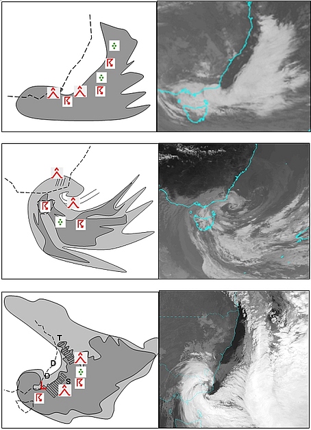 Figure 20: Schematic of weather associated with the EXCY events of 12 June 2013 (top), 26-27 December 1998 (center) and 26 June 2007 (bottom) with corresponding satellite images.