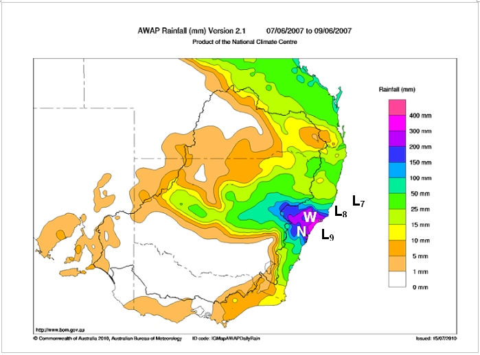 Figure 21: Three-day rainfall to 0900 EST 9 June 2007 from the Australian Water Availability Project rainfall analyses. Location of the surface low at 00 UTC 7 June (L7), 00 UTC 8 June (L8) and 00 UTC 9 June (L9) as shown. The location of Williamtown and Norah Head are also shown. Diagram from Mills et al. 2010