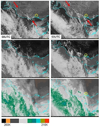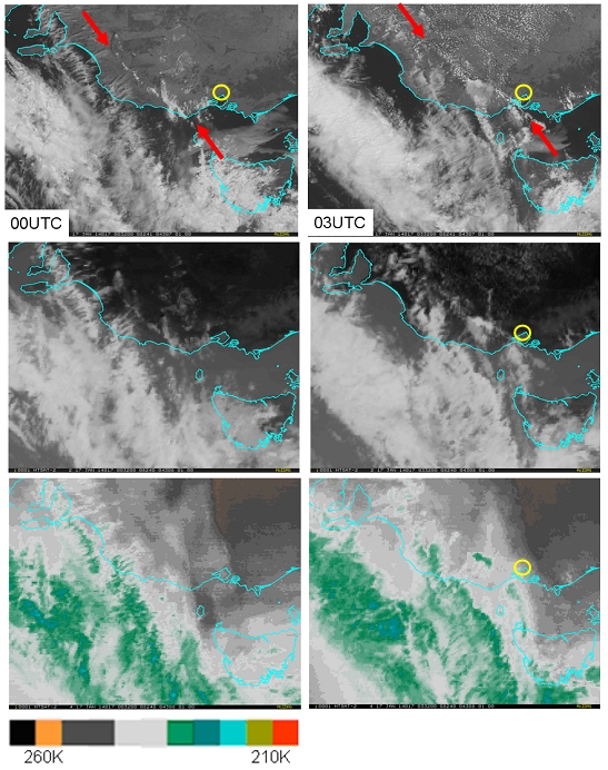 The Type 2 shallow cold front which crossed western parts of Victoria, Australia on the 17 January 2014 at times 00UTC and 03UTC is annotated by red arrows and shown in the visible (top), infrared (middle) and enhanced water vapour imagery (bottom). Clearly the visible image is the best for viewing this feature, though the infrared image may be useful at night. The location of the city of Melbourne is shown as a yellow circle.