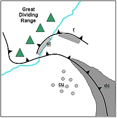 Schematic of the cloud signatures of a Southerly Buster that can be detected in satellite imagery.